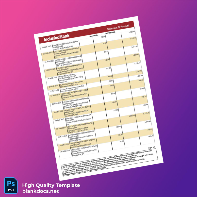 India IndusInd Bank Statement Template in Word and PDF Formats