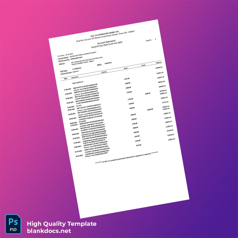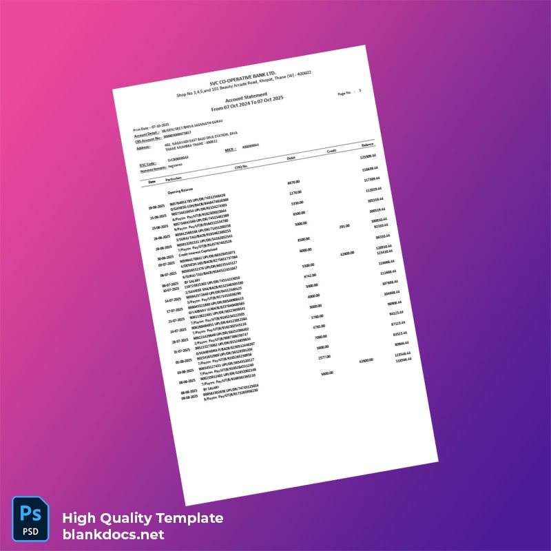 Are you facing delays in obtaining your bank statements? The India SVC Co-operative Bank Account Statement Template is designed to address your urgent needs with efficiency and professionalism.
