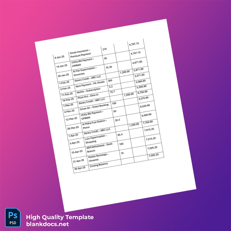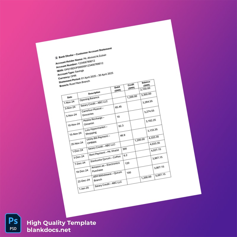 Discover the Oman Bank Dhofar Statement Template, a versatile and essential tool for professionals needing quick access to bank statements in both Word and PDF formats. This editable bank statement template is designed to cater to your needs with precision and ease.