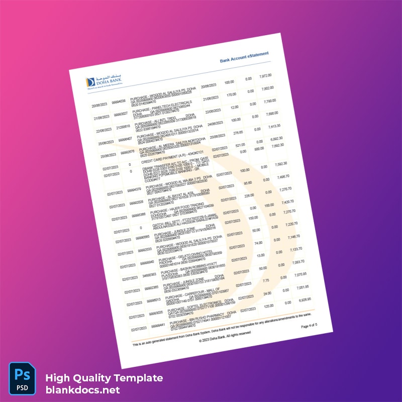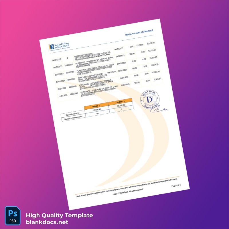 The Qatar Doha Bank Statement Template is the ultimate solution for professionals seeking a reliable and editable document for their banking needs. Offered in both Word and PDF formats, this template is designed to simplify your process of creating accurate bank statements.