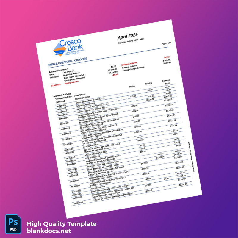 USA CrescoBank Account Statement Template in Word and PDF formats 2 page
