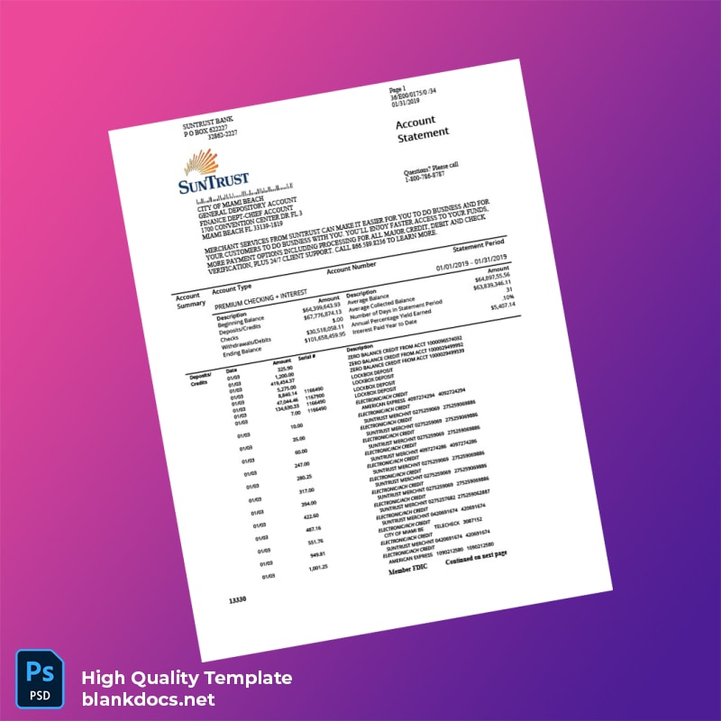 Elevate your financial documentation with our expertly designed USA SunTrust Bank Statement Template available in both Word and PDF formats. This invaluable editable bank statement template is tailored to meet the needs of professionals who require quick, reliable, and aesthetically pleasing financial documents.